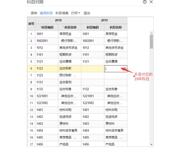 3.在对照列表中,找到那些18年年度有科目,但在19年年度科目列中为空的记录,在19年选择好科目进行手工对应,如图下: