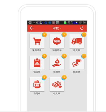 可对采购订单、进货单、销售单、付款单、费用单、请购单、要货单等单据做移动审批,随时、随身,助您第一时间妥帖处理公司事务。