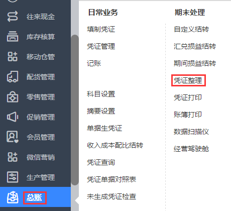 Step1:进入【总账】-【期末处理】-【凭证整理】;