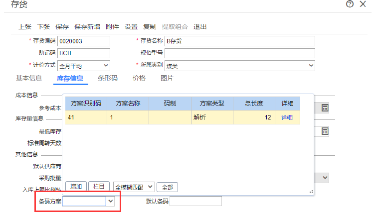 选择商品条码方案入口:【基础设置】-【业务信息设置】-【存货】-【存货档案卡片】-【库存信息】-【条码方案】