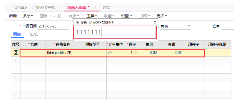 设置完条码方案之后,录出入库单据时,点击【更多】-【条形码录入】,可以手工录入条形码,按【enter】之后带出存货;也可以使用扫描设备扫描条码,扫描之后直接带出存货。