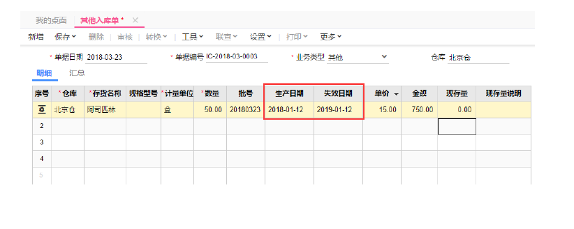 启用有效期管理的存货,在录出入库单据时,需要录入生产日期和失效日期才可以保存单据。