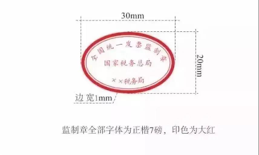 新启用的发票监制章形状为椭圆型,长轴为3厘米,短轴为2厘米,边宽为0.1厘米,内环加刻一细线,上环刻制“全国统一发票监制章”字样,中间刻制“国家税务总局”字样,下环刻制“××省(区、市)税务局”字样,下环字样例如:“上海市税务局”。字体为楷体7磅,印色为大红色。