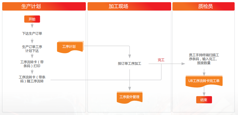 下达生产订单后,生产订单经审核,由计划员根 据工艺路线生成该订单的工序计划,并打印出工 序流转卡,工人根据下发的流转卡领料开始各工 序生产。工序加工完成后交检,由质检员扫码报 工,录入合格数量及不良数量,并记录加工工人 的工号,通过手持端扫描推送流转卡完工单。