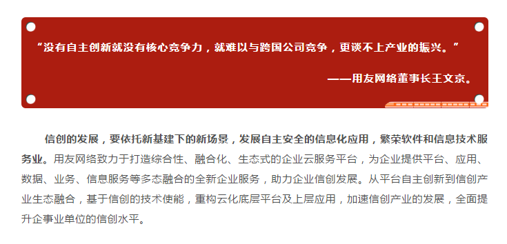 此次大会为了表彰在互联网生态领域做出杰出贡献的企业,释放经济发展新动能,特设立专项奖项,为企业在信创产业发展方面提供优质服务商遴选名录。用友网络作为在互联网产业创新领域具备雄厚实践基础的企业,应邀参与2019-2020年度互联网产业生态领域创新贡献奖项评选,通过专业用户投票、专家组评审委员会等一系列严格评审过程,用友网络以在信创服务领域的突出贡献获得行业认可,荣膺“2019-2020年度最佳信创服务奖”。在加快关键核心技术突破,推动国产基础软硬件持续迭代升级,促进信息产业创新发展,加强行业信创方面做出积极实践。