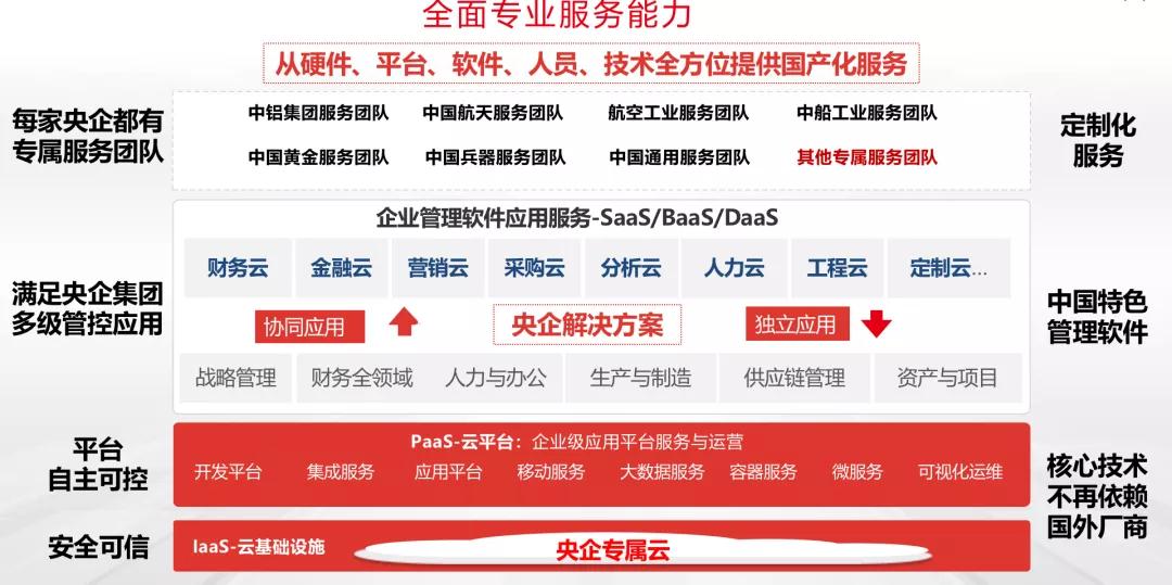 用友网络信创服务的优势在于其完善的服务体系,能够帮助大型企业实现 人、财、物、客的全面数字化,从而驱动业务创新与管理变革,这在央企客户的信息化建设过程中得到最佳实践。由于央企是我国经济发展的重要推动力,因此是发展信创的首要阵地,发展信创的意义和迫切性也更为凸显。用友网络基于丰富的行业经验,想用户之所想,聚焦安全可控、自主创新、数字化平台建设等信创发展重点方向,配备央企专家团队,全面开展央企信创服务工作,服务央企客户占比已经达到央企基数的 68%以上。在安全可控方面,以中国航天科工集团为例,用友网络完成其HR项目全面适配,形成全方位的国产体系生态,从储存、中间件、操作系统及数据库层,实现了国产化适配的重大意义;在自主创新领域,如中国国旅,通过与用友网络合作进行财务共享服务中心建设,推动了企业财务转型升级,实现了财务服务和监督质量和效率的双效提升,支撑企业快速高效发展,摸索出了一条适合中国国企财务变革管理发展之路;在数字化平台建设方面,用友网络为中国节能环保集团有限公司搭建集团公司财务管理信息化平台,全面实现集团公司财务信息集成,为集团公司财务管理提供管控支撑,积极推动财务管理向价值创造转型,支撑主业快速发展与转型升级,打造集团公司财务信息云时代,体现管理创新,提升企业的行业竞争力。