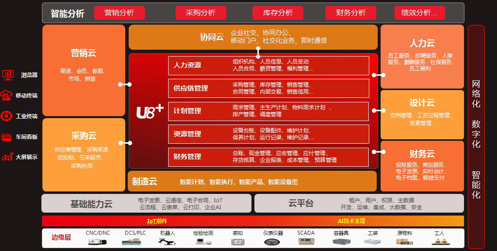 U8+智能制造整体解决方案包括财务管理、CRM管理、供应链管理、生产制造、新零售、HR、商业分析、社交协同等核心应用,同时包含了所有现在互联网当中所应用到的全新技术,像工业大数据体系,物联网、移动互联网和企业社交产品与平台体系,还有云计算云服务体系等。具有网络化、数字化、智能化的技术特征。
