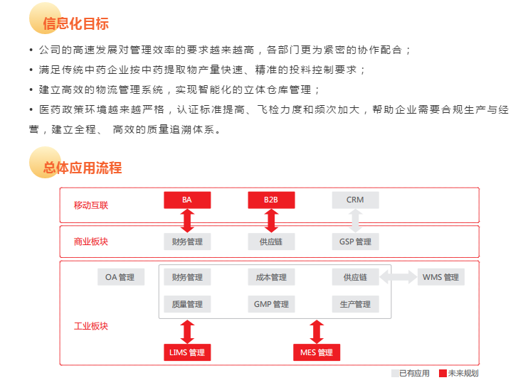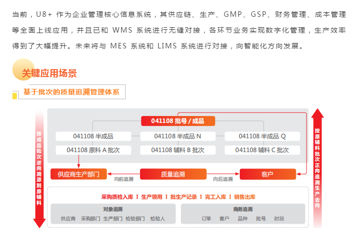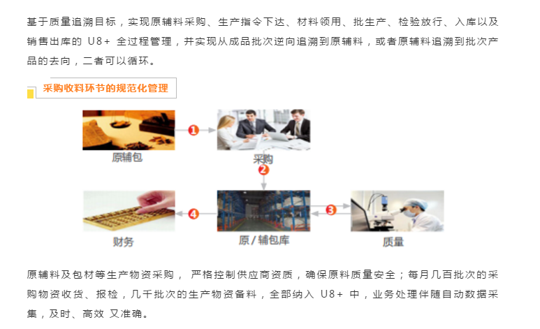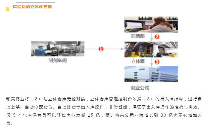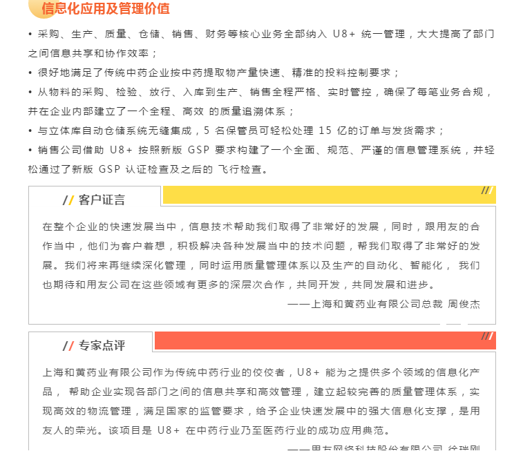 上海和黄药业有限公司属于老牌的中药企业,拥有丸剂、片剂、注射剂等12 大类剂型,麝香保心丸、胆宁片、生脉注射液等 70 个品种,麝香保心丸为国家中药保密品种。和黄药业的工业生产和营销供应链全部纳入 U8+ 管理, U8+ 与立体仓库无缝集成,形成了敏捷的物流管理体系,高效的质量追溯体系,满足了国家GSP、GMP的监管要求。U8+高效的信息化平台必将助力企业更快速发展。