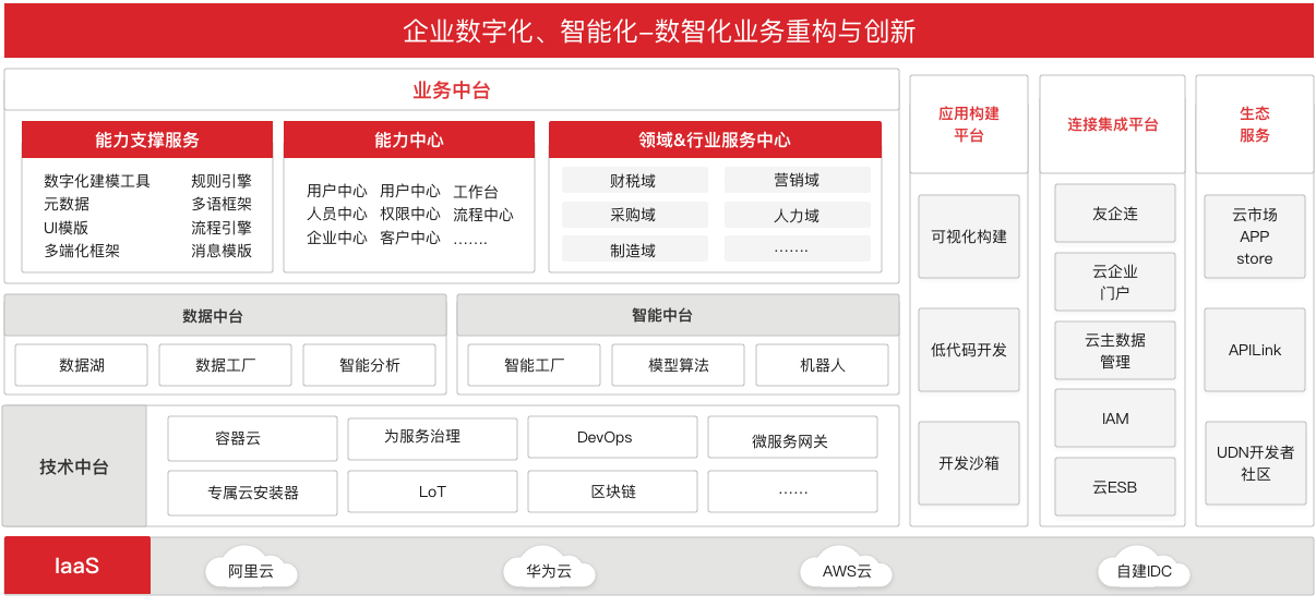 用友云平台iuap,依托云计算、大数据、人工智能、区块链、5G、物联网等技术,服务于成长型、大型及巨型企业数智化转型,助力企业提升数字化技术驾驭能力。基于技术中台、数据中台、业务中台、AI中台四大中台产品。