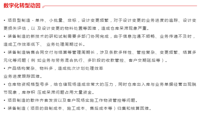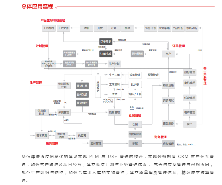 华恒焊接公司专注焊接自动化装备的研发、生产和销售管理,U8+ 导入实现装备制造 CRM 客户关系管理,加强销售商机跟进、销售经营、业务员行动计划、售后服务等管理;实现项目合同承接、交付、结算管理;建立批次计划下达、业务进度跟踪管理,强化仓库与车间的业务和实物管控,实现质量追溯管理;完善项目成本归集与核算管理,帮助企业实现智能制造、 数字化经营管理。