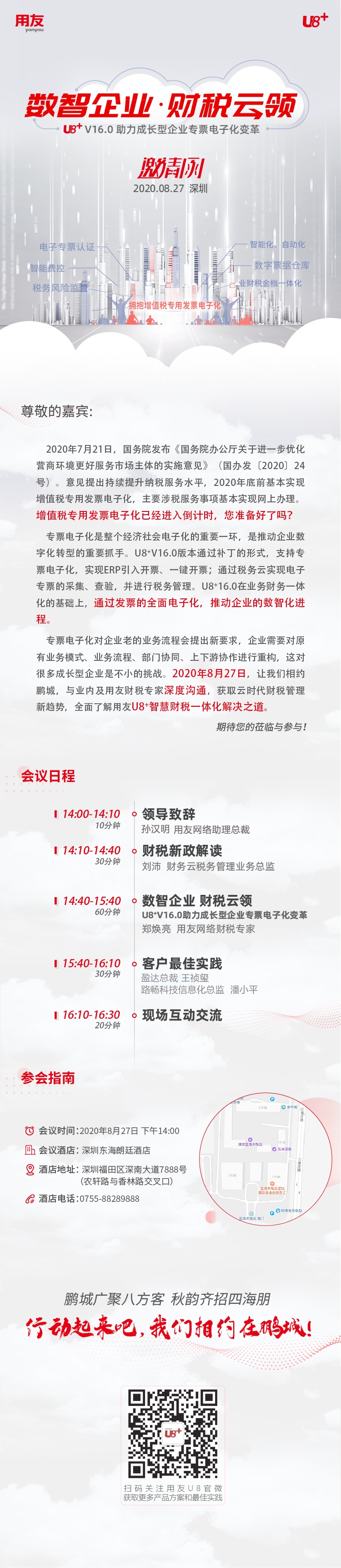 【深圳站 · 邀请函】数智企业 财税云领——U8+V16.0助力成长型企业专票电子化变革