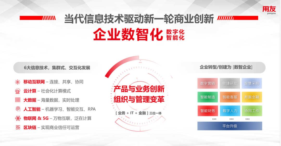 用友首次提出并定义BIP(商业创新平台)的概念:基于当代最新信息技术,赋能企业通过数字化、智能化,开展产品与业务创新,组织与管理变革,重构/构建企业发展力的平台型、生态化多元服务体。