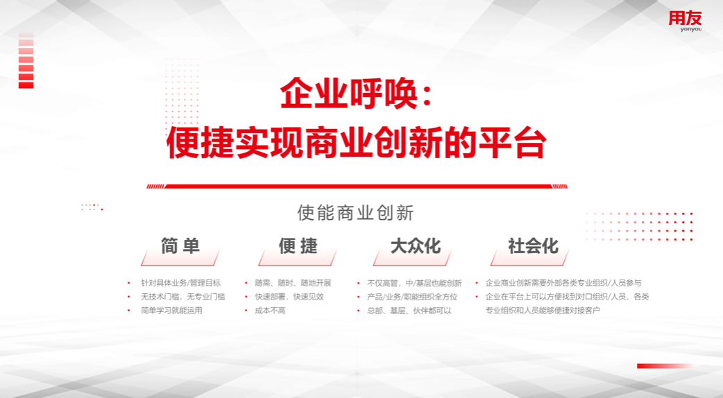 企业呼唤便捷实现商业创新的平台,让商业创新简单、便捷。企业通过商业创新平台能够更加聚焦自身的业务和管理目标,没有太高的技术与专业门槛,通过简单的学习就能够轻松运用技术、随需随时随地快速开展业务、迅速部署,以更低成本实现更高业务目标。