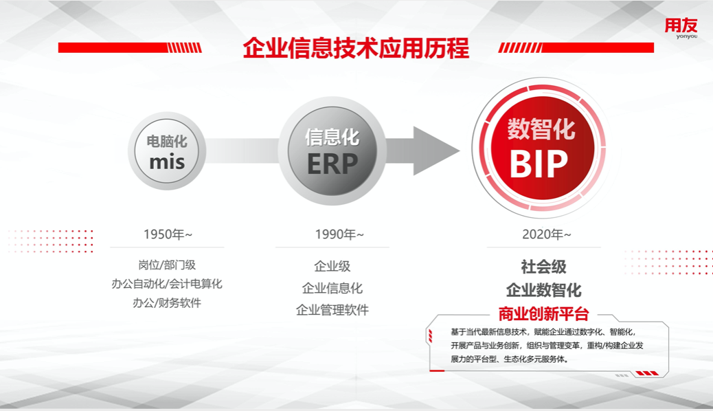 从企业信息技术应用的发展历程来看,在上世纪五十年代企业已开始岗位级或部门级应用信息技术来实现办公自动化、会计电算化,我们称之为“电脑化”阶段,代表系统为MIS,办公软件、财务软件为企业主要的信息技术应用。上世纪九十年代初,信息技术在企业的应用走向企业级,我们称之为“信息化”阶段,代表系统为ERP,企业管理软件为企业主要的信息技术应用。近年来,信息技术在企业的应用进入到一个新阶段,我们称之为“数智化”阶段,代表体系为BIP(商业创新平台),使信息技术的应用与发展走向社会级,是一个能够便捷实现商业创新的平台。
