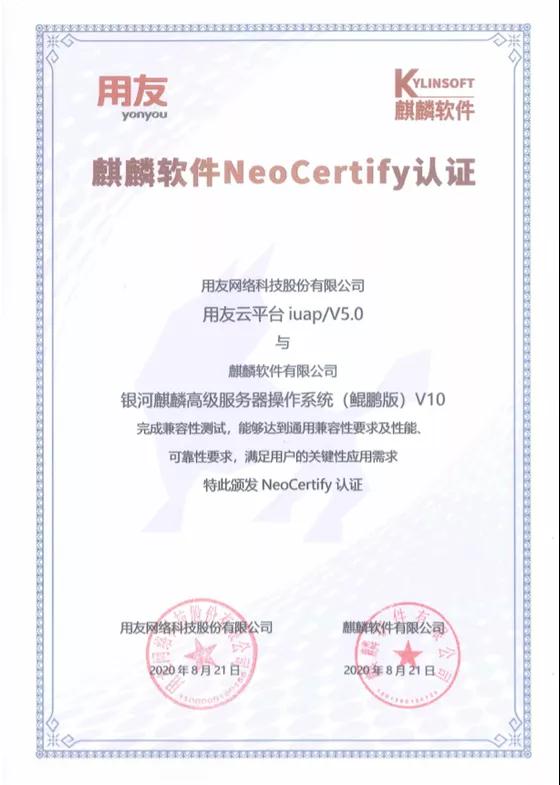 近期,用友iuap云平台与麒麟软件完成兼容性测试,确定银河麒麟高级服务器操作系统(鲲鹏版)V10与用友iuap云平台/V5.0能够达到通用兼容性要求及性能、可靠性要求,可满足用户的关键性应用需求。用友iuap云平台/V5.0获得麒麟软件NeoCertify认证。