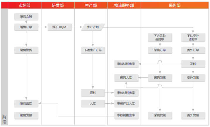 客户贴合实际业务以销售合同为起点,合同标的下发至业务端、收款阶段传递至财务端,减少了销售部门的查询、整理工作。同时配合 研发的物料清单维护、生产计划的生产工单下发,把生产业务也纳入 ERP 流程,做到了企业信息化整体平台搭建,为后续企业持续精益 经营奠定优良基础: