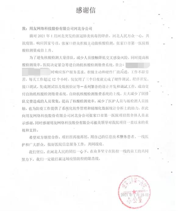 由于在本次项目中的卓越表现,用友河北分公司项目组人员于近日收到了张家口市第一医院的感谢信。