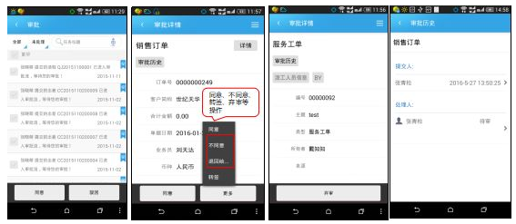 ・ 公司管理人员随时自动接收U8+业务系统推送的即时审批消息,随时进行业务单据审批。可以根据情况批量审、逐项审;可同意、不同意、转签、弃审等多种审批结果,并支持查看审批历史。