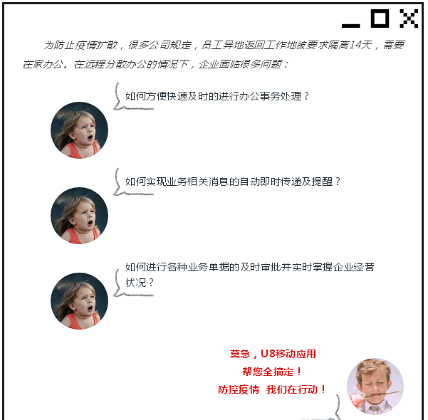 眼下新型冠状病毒疫情肆虐,原定1月31日复工的企业已经延长假期,部分省市延长到2月10日之后,这样不仅造成各地员工复工到岗时间不同,上下游供应链复工时间也不同,制造业想要快速复工,面临内部和外部诸多不确定因素,在此复工之际如何最大限度降低疫情影响,实现快速复工,U8+来帮快速应对。