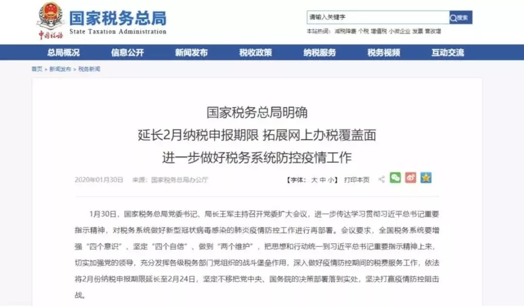 为了支持各地疫情防控,缓解企业遇到的问题,税务总局明确在全国范围内将2月份纳税申报期限延长至2月24日,其中湖北地区延长至3月6日。对受疫情影响办理申报仍有困难的纳税人可依法申请进一步延期。同时,也希望纳税人尽可能网上办理涉税事项,提高办税效率。
