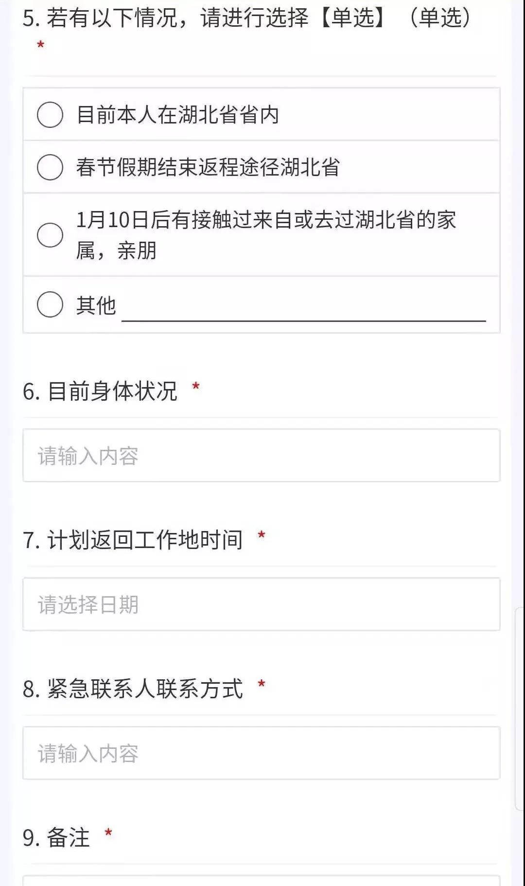 可以运用统计助手、金数据等问卷工具小程序,采集员工所在地、目前身体情况、近期是否有去过武汉、是否与去过武汉的人有密切接触史以及预计返岗日期等信息。