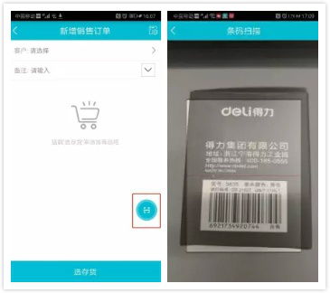 2.点击下销售订单、销货单支持扫描下单,增加【扫描】快捷键,支持条码扫描选择存货: