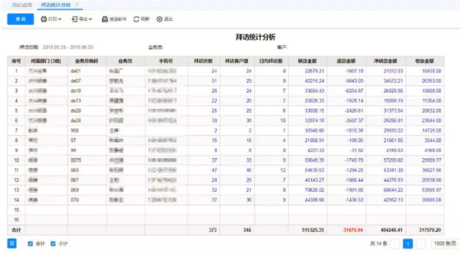 后台通过拜访统计分析表可以查看不同维度(部门、业务员、客户)的实际拜访客户量、拜访成单金额、收款金额等。