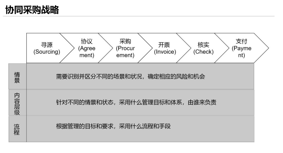 企业应建立协同采购战略,这其中包含了寻源、协议、采购、开票、核实、支付全流程环节,从各个环节实现对采购物资状态的判断,根据采购的重要性和复杂性制定协议,根据价值/利润影响和供应风险来选择采购手段,最终选择合理的支付方式、资金控制手段和财务对账手段。