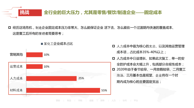 以某化工厂企业为例,在经历危机之前,这家化工厂的材料成本占总成本的55%左右,人力和运营成本约占35-40%;而在此次危机中,该企业很难维持业务生产。