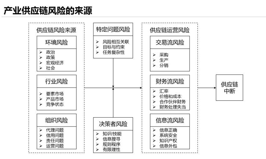 从风险来源上看,供应链风险来源包括环境风险、行业风险、组织风险;供应链运营风险包括交易流风险、财务流风险、信息流风险,这些风险都有可能导致供应链中断。