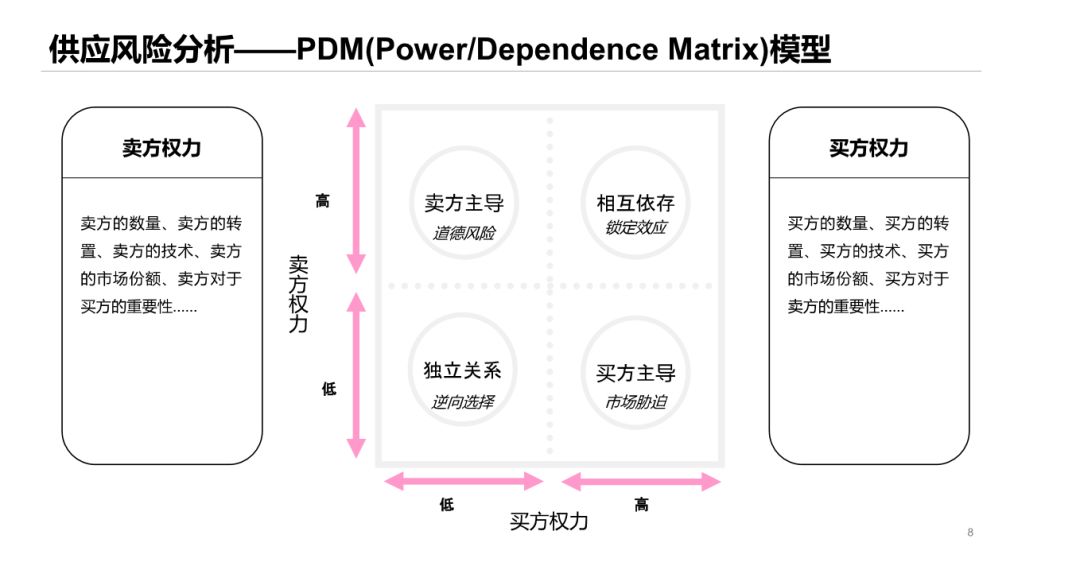 而在对供应风险概念进行阐述的基础上,宋华教授引入了两个供应风险经典模型:1) PPM(Purchasing Portfolio Matrix)模型从成本价值和供应风险两方面对采购物资进行了重新定位。2) PKM(Power/Dependence Matrix)模型对采购中的供需关系进行了重新定位。