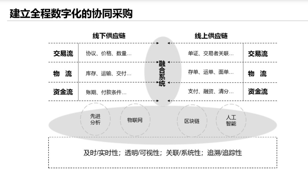 建立全程数字化的协同采购平台,一是要实现线上线下的融合,二是要有区块链、物联网、区块链、AI等现代现金技术支撑,以实现采购的及时/实时性、透明/可视性、关联/系统性、追溯/追踪性。