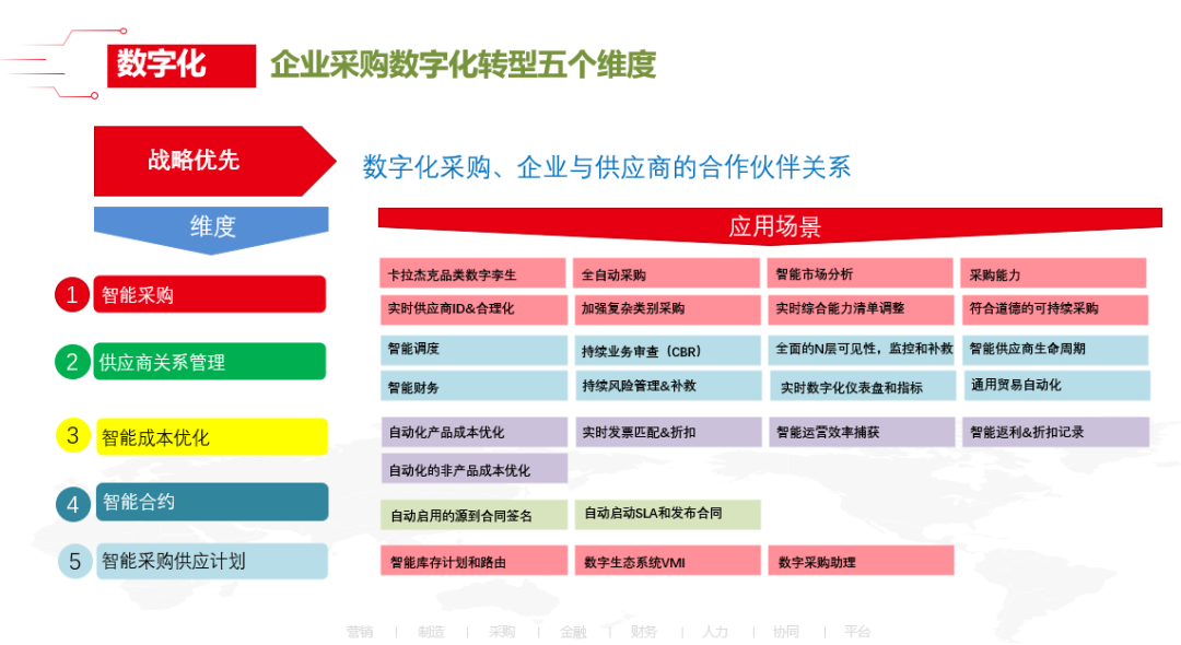 关于数字化采购,可划分为涵盖智能采购、供应商关系管理、智能成本优化、智能合约、智能采购供应计划5个部分,每个部分对应不同的业务场景。