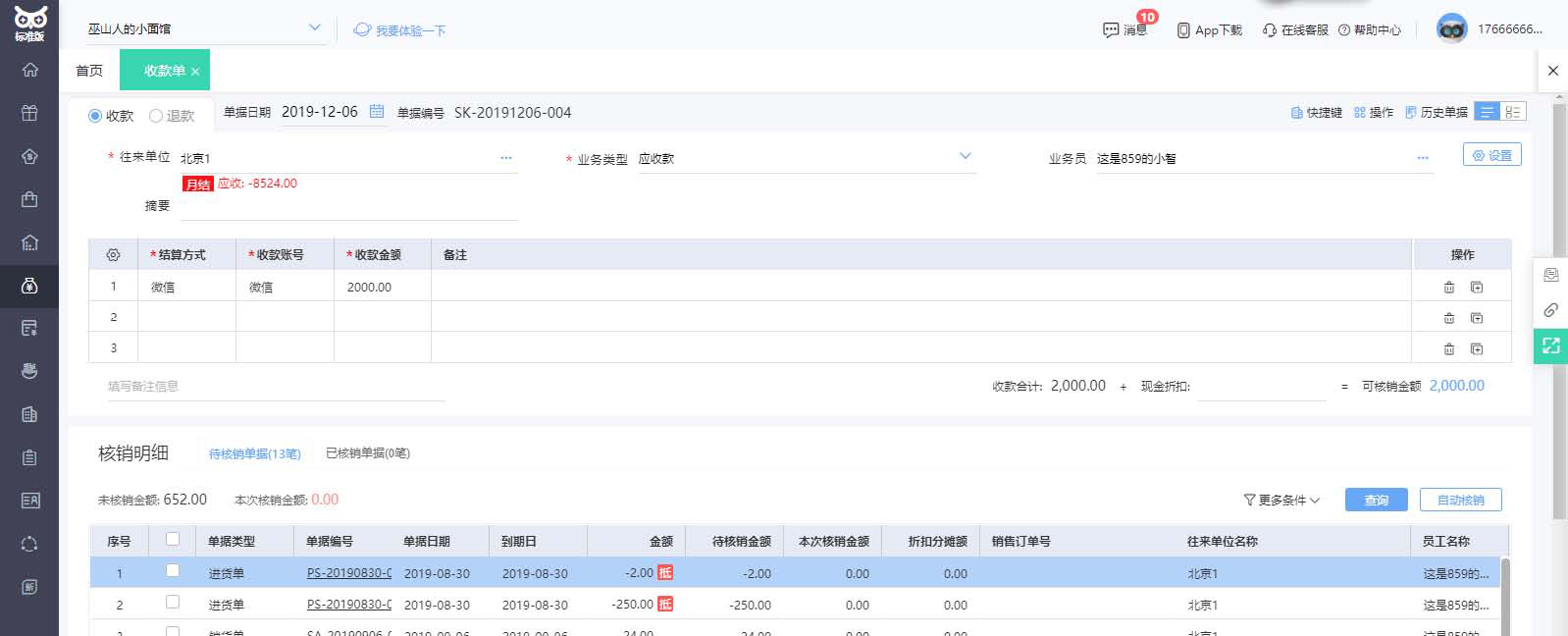 ü 收应收款:手工增加收款单,可以在表体核销明细中选择此次收款对应的销货单有哪些,对于既是供应商又是客户的往来单位,进销相抵以后再进行收款和付款。收款单保存后,直接进行核销。