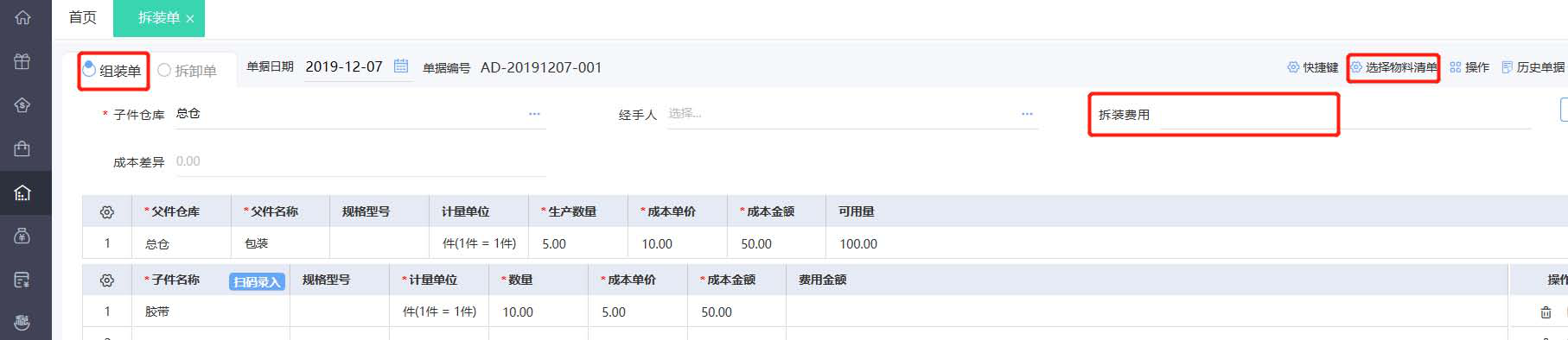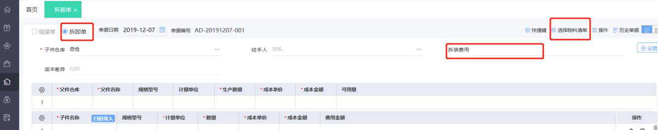 ü 对于没有事先维护物料清单的情况下,也可以先进行拆装业务,完成后,可以以当前折装比例生成物料清单。