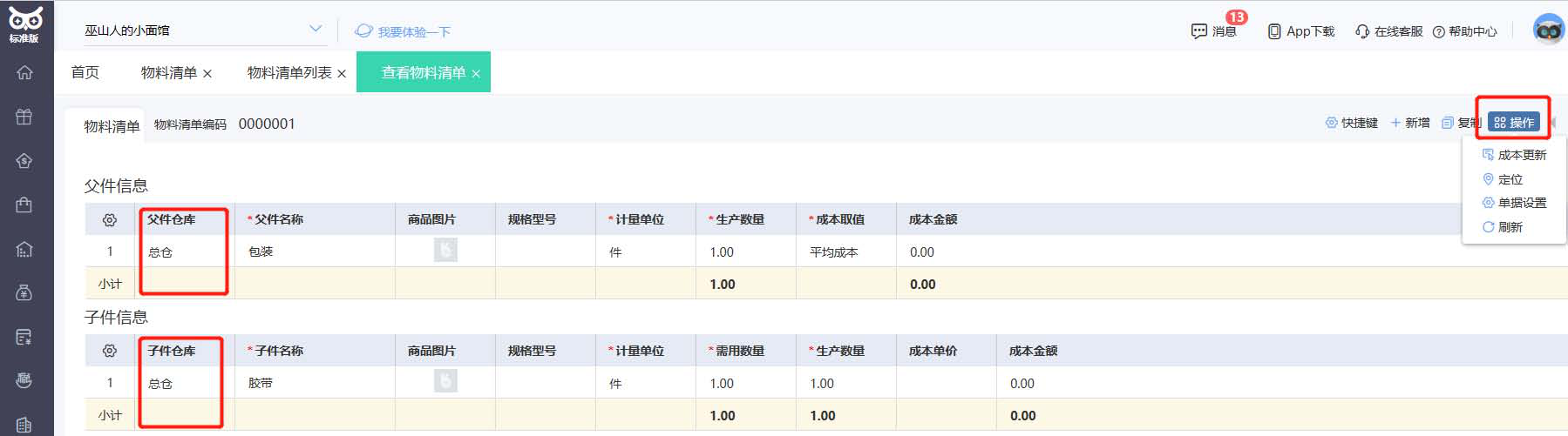 ü 支持设置默认父件仓库和子件仓库,以便在拆装业务中自动带出。