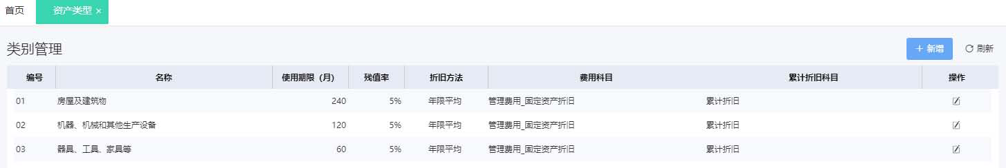 ² 可根据需要,点击右上方“新增”按钮自行新增固定资产类别,方便固定资产管理界面信息调用。
