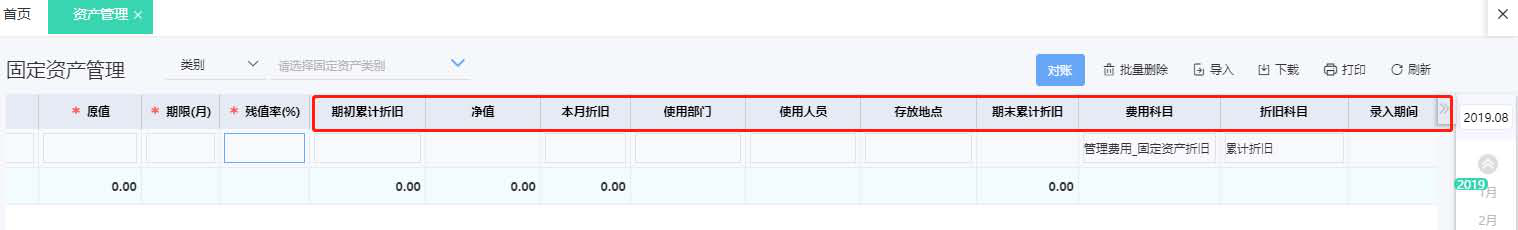 ² 固定资产档案按照从左至右的顺序录入数据,自动根据资产所选类别、购入年月、原值等数据,计算期初累计折旧额,当月折旧额、期末累计折旧额。