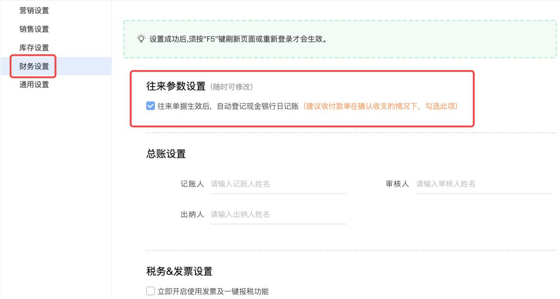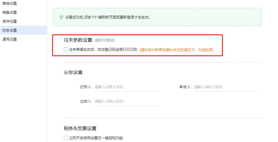 ² 业务单据和日记账分别登记,后续核对:需要通过参数进行配置。操作:系统管理-选项设置-财务设置,往来参数设置,不勾选“往来单据生效后,自动登记现金银行日记账”