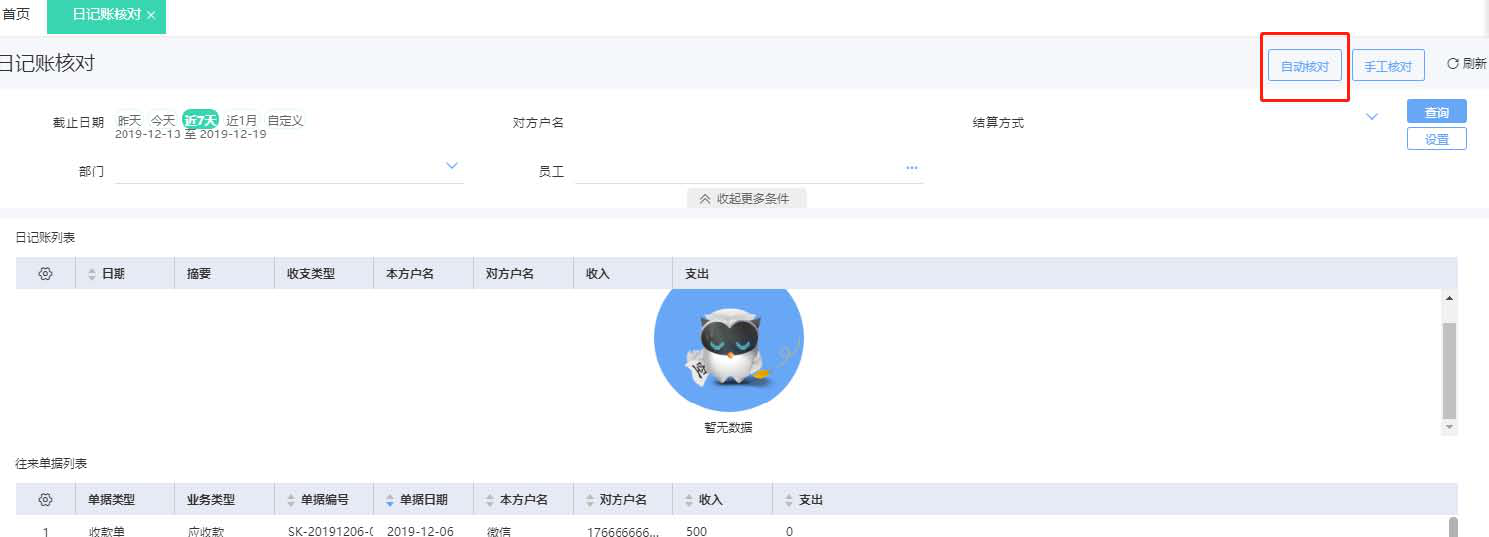 n 【日记账核对-自动核对】:分为上下列表,上列表显示日记账记录,下列表显示往来单据记录。点击“自动核对”,系统会按照核对金额和方向,自动进行匹配,勾选进行核对;