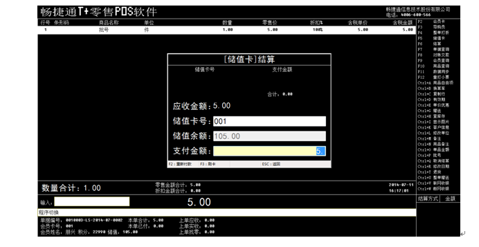 也可以按F6选择其他结算方式,但是这个界面的储值卡结算金额不能手工填写,只能按F5然后会直接切换到储值卡结算界面。