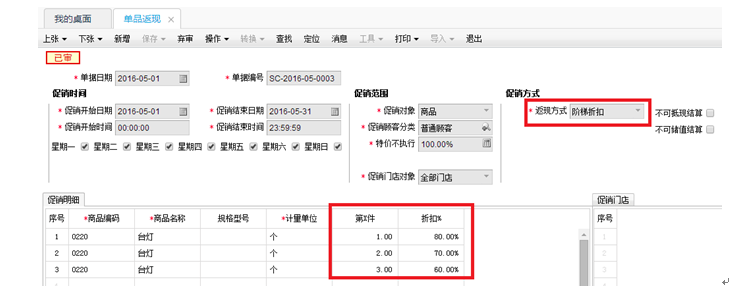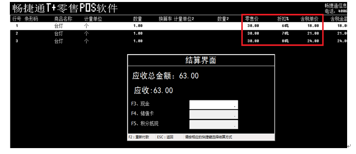 在POS端中,按F6收银时,才会执行“单品返现”促销方案,如下图所示,根据零售数量不同,享受的折扣也不同: