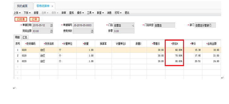 对账收款后,在零售结算单界面根据零售数量显示不同的折扣: