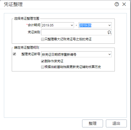 【只整理最大记账凭证号之后的凭证】:勾选时只对最大记账凭证的编号之后的未记账 凭证进行编号整理,不勾选时,则对所有凭证进行编号整理。