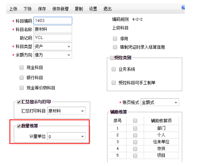 3. 原材料或是库存商品科目设置数量核算。