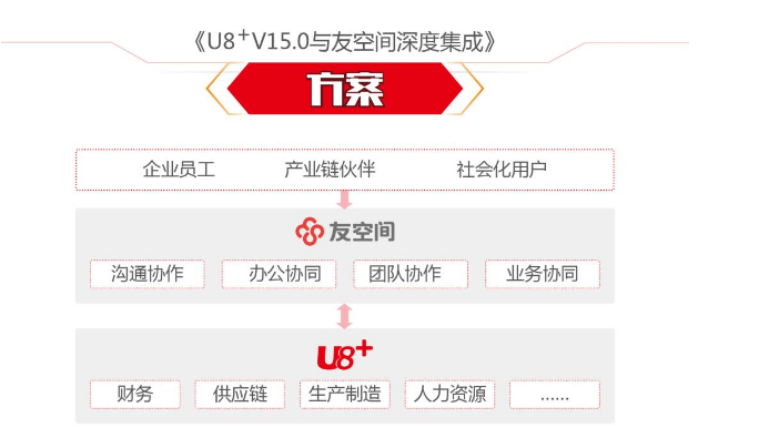 友空间与U8+实现业努深度融合:友空间作为办公协同门户,统一服务入口,并接受U8+产生的业务消息;在友空间中实时处理U8+中的相关业务业务,移动审批、销售下单、营销服务、薪资查询、报表查询、统一考勤。