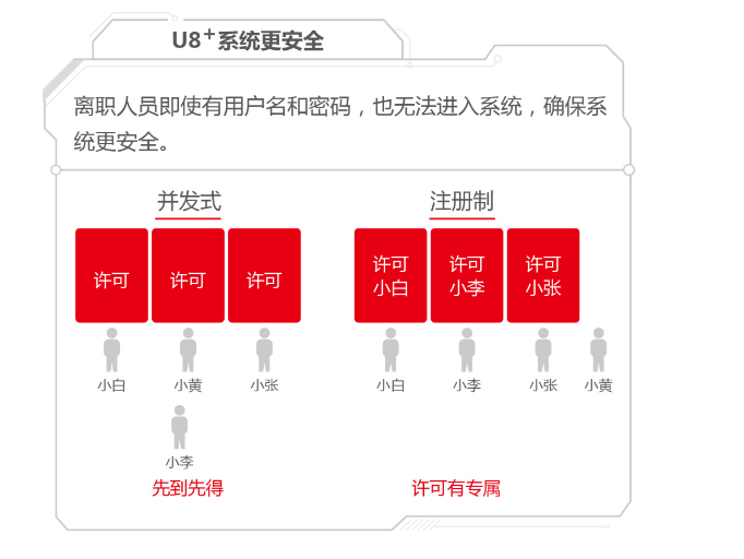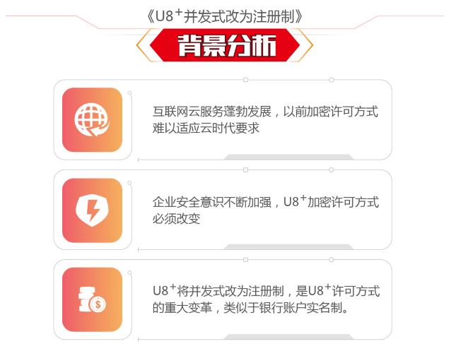 互联网云服务蓬勃发展,以前加密许可方式难以适应云时代要求;企业安全意识不断加强,U8+加密许可方式必须改变;U8+将并发式改为注册制,是U8+许可方式的重大变革,类似于银行账户实名制。
