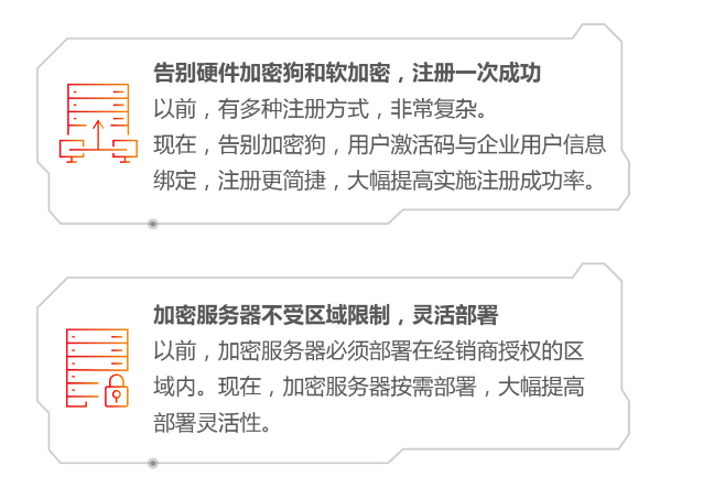 告別硬件加密狗和软加密,注册一次成功。以前,有多种注册方式,非常复杂。现在,告別加密狗,用户激活码与企业用户信息绑定,注册更简捷,大幅提高实施注册成功率。加密服务器不受区域限制,灵活部署。以前,加密服务器必须部署在经销商授权的区域内。现在,加密服务器按需部署,大幅提高部署灵活性。