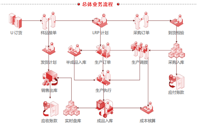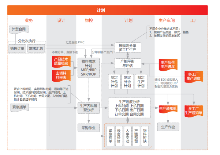 利用 U8+ 行业解决方案,由 U 订货、样品管理、报价管理、计划和生产(计划、采购、生产、委外)、质量检验、仓储与预算 等业务板块组成,解决了企业生产排程、原料保障、准时交货、预算与成本管理等重要问题,将整个营销、计划、生产、财务等业务
