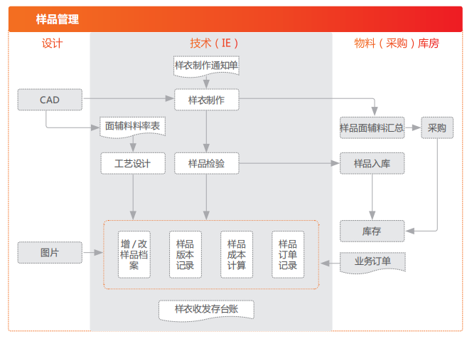 • 由于企业主要依据客户来样生产,样品管理是其中一环,需要对于样品的物料、工艺、图片等资料的全面管理。